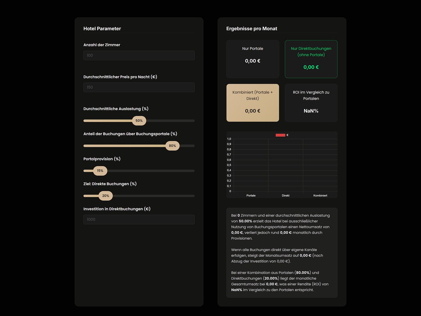 Nach der Eingabe Ihrer Hotelparameter sehen Sie sofort, wie sich Direktbuchungen im Vergleich zu Buchungsportalen auswirken. Der ROI Kalkulator zeigt Ihnen auf einen Blick, welche Einnahmen über Portale entstehen, wie viel Sie mit Direktbuchungen gewinnen – und wie groß der Unterschied wirklich ist. So behalten Sie die volle Kontrolle über Ihre Ergebnisse – klar, verständlich und in Echtzeit.